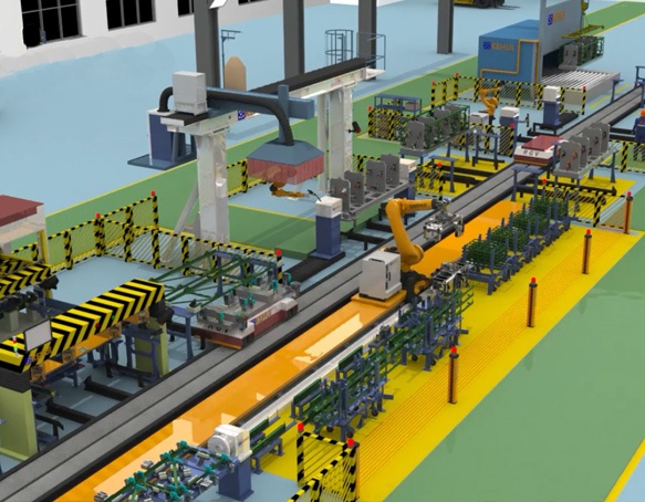 整條智能化柔性生產(chǎn)線從左向右呈“一”字型布置的柔性焊接生產(chǎn)線,共劃分為包含生產(chǎn)工位和存放區(qū)域在內(nèi)的15個工位區(qū),能夠滿足多種系列工件的共線生產(chǎn)。生產(chǎn)線采用焊接機器人、裝配機器人、RGV、自動換槍裝置、自動檢驗校對平臺、伺服翻轉(zhuǎn)變位機、物料快裝定位小車、柔性工裝、回火爐等,通過信息化生產(chǎn)指揮調(diào)度系統(tǒng)統(tǒng)一調(diào)試生產(chǎn),實現(xiàn)裝配焊接工位標準化、作業(yè)過程程序化、部件裝卸運輸自動化、生產(chǎn)管理信息化。